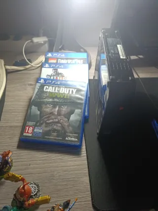 Console PlayStation 4 in colore nero, pronta per ore di intrattenimento. Include tre videogiochi: LEGO Dimensions, Call of Duty: WWII, Battlefront.