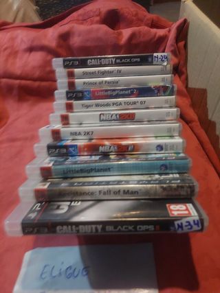 Vendo console Playstation 3 in colore nero, insieme a 9 videogiochi e due controller. - Include cavo HDMI. - Giochi: Sports Champions 2, FIFA 15, Virtua Tennis 4, FIFA 13, El Libro de los Hechizos, Las Aventuras de Tintín, Gran Turismo 5 Academy Edition, EA Sports Masters, Call of Duty Black Ops. - Controller nero originale. - Controller blu e bianco.