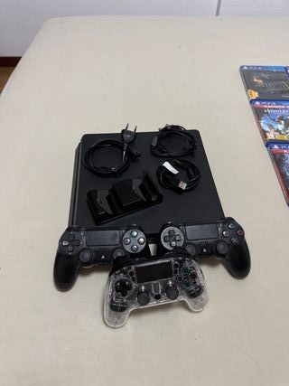 Consola PlayStation 4 Slim nera. Includo tre controller (due di essi originali). Giochi inclusi: Grand Theft Auto V, Gran Turismo Sport, FIFA 17, FIFA 18, FIFA 19, Rayman Legends, Mafia III e Farming Simulator 17. 408,5 GB di spazio libero. Cavo HDMI non incluso.