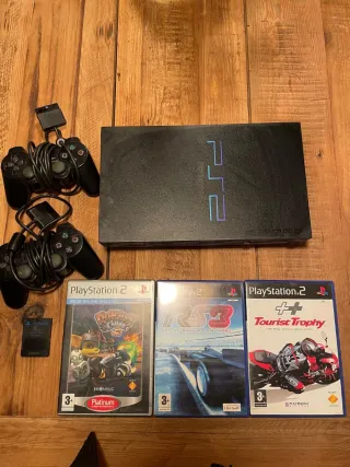 Console PlayStation 2 nera con due controller, una scheda di memoria e tre giochi. Giochi inclusi: Ratchet & Clank 3, R3 Racing Simulation Three, Tourist Trophy. Due controller originali. Scheda di memoria da 8MB. Tutto funziona perfettamente ed è tutto originale.