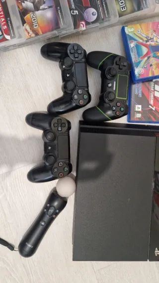 Console Playstation 4 in colore nero. Include controller e giochi. - 3 Controller inclusi (2 originali) - 6 Giochi inclusi. - Microfoni inclusi. Si vende per non utilizzarla ma funziona perfettamente, l'unico elemento mancante sono i cavi di ricarica dei controller e il cavo HDMI che si è rotto.