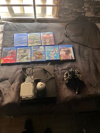 Consola PlayStation 4 in colore nero, pronta per l'uso. Include 8 videogiochi: Driveclub, Call of Duty: Legacy Edition, Just Cause 3, NBA 14, MotoGP 15, FIFA 19, un gioco senza titolo visibile e un altro gioco senza titolo visibile. Include anche un controller e un mouse. La cover della console deve essere trovata e il pulsante di accensione non funziona, ma si accende con un disco. Il pulsante R1 non funziona, quindi il prezzo è ridotto.