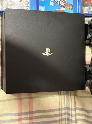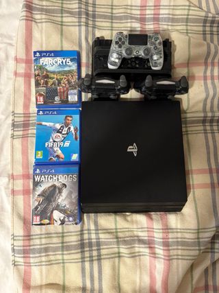 Console PlayStation 4 Pro da 1 TB in colore nero. Include i giochi: Far Cry 5, FIFA 19 e Watch Dogs. Include tre controller DualShock 4 e un supporto di ricarica. Il coperchio del disco rigido è rotto, ma non influisce sul funzionamento.