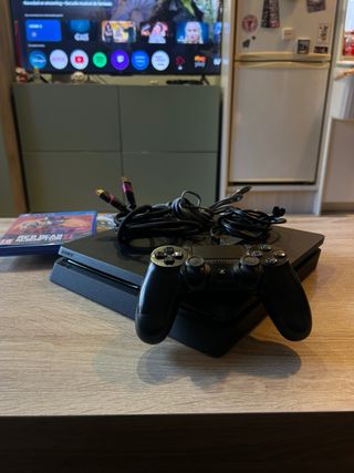 Consola PlayStation 4 Slim in colore nero, insieme a due controller neri e (un controller aggiuntivo rosa e oro per 25 euro). Include tre videogiochi: Dead Island 2, Rocket League, Grand Theft Auto V Premium Edition. Include tutti i cavi necessari per il suo funzionamento. Ritiro a mano a Pinto (Madrid).