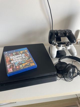 Console PlayStation 4 in colore nero. Include il gioco Grand Theft Auto V. Due controller (uno bianco e uno nero) e un controller aggiuntivo non visibile nelle foto. Include cuffie nere. Cavi, supporto e caricatore per controller.