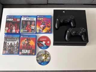 Console PlayStation 4 in colore nero, con due controller e vari videogiochi. - Console PlayStation 4 - Due controller DualShock 4 - Giochi inclusi: NBA 2K16, F1 23, F1 24 (versione digitale), NBA 2K23, Assassin's Creed Syndicate, Red Dead Redemption 2, FIFA 20, FIFA 17