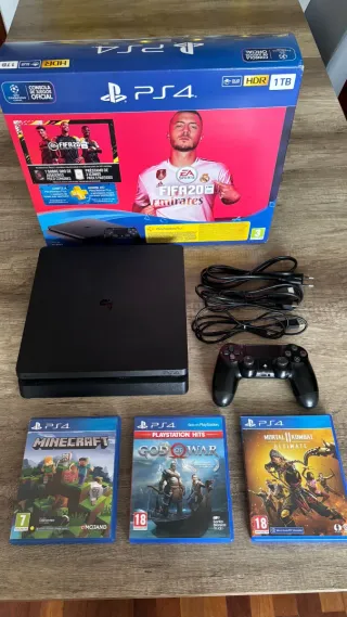 Console PlayStation 4 Slim da 1TB in colore nero, edizione FIFA 20. Include il controller DualShock 4. Necessita di cablaggio per il funzionamento. I giochi sono venduti separatamente: Mortal Kombat a 20€, Minecraft a 15€, God of War a 10€.