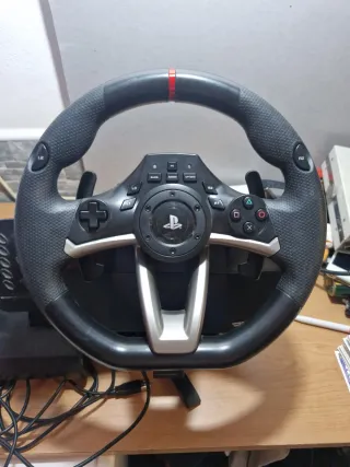 Volante da guida per PlayStation 4 con pedali. Design ergonomico per una presa comoda. Pedali di accelerazione e freno inclusi. Marca Hori. Ha la leva rotta per fissarlo al tavolo, da qui il suo prezzo, ma può essere fissato lo stesso.