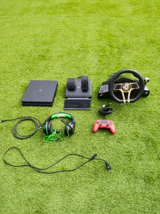 Pacchetto con console PS4 Slim, volante da corsa e cuffie. - Console PS4 Slim. - Volante da corsa con pedali. - Cuffie con microfono.