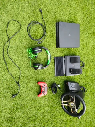 PlayStation 4 Slim in perfetto stato. Può includere 8-9 giochi. Funziona perfettamente, senza problemi. Non ha più di 10 giorni di utilizzo. Possibilità di aggiungere volante Thrustmaster T150.