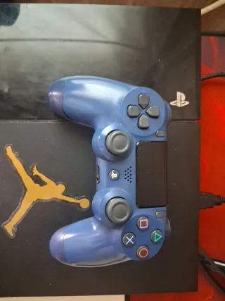 Console PlayStation 4 in colore nero, con un controller blu. Design elegante e compatto. Include un controller DualShock 4 blu. VOLANTE FR Formula 1 quasi nuovo, PEN DRIVE per salvare i giochi, Auricolari marca PlayStation, GIOCO DRIVECLUB (Grafica 4K HD), GIOCO FIFA 20.