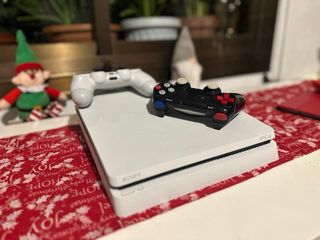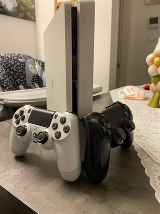 Console PlayStation 4 Slim in colore bianco. Design compatto e leggero. Finitura opaca. In regalo i controller, il rosso funziona perfettamente, gli altri potrebbero avere problemi.