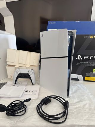 Console PlayStation 5 in bianco. Include tutti gli accessori originali, il controller DualSense, i cavi di connessione (il cavo di ricarica del controller non incluso, è un tipo c normale) e l'imballaggio originale. Modello Slim con lettore, 1000 GB. Include garanzia estesa a 4 anni dalla data di acquisto il 23/09/2025. La vendo perché l'ho comprata pensando di usarla e non l'ho usata, è in ottime condizioni, nelle foto si può vedere un graffio sul retro e la scatola originale è un po' rotta (si è rotta facendo le foto). Sono attento ai messaggi e ascolto offerte, accetterei anche scambi.