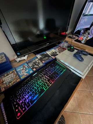 Vendo in bundle -PS4 Bianca prima edizione (funziona perfettamente ha solo una piccola frattura sulla plastica dietro) -Pad ps4 blu scuro perfettamente funzionante (la parte sotto della plastica è un po rialzata ma non si vede neanche) -7 giochi tra cui, resident evil village (copertina un po rovinata), god of war GTA V, FIFA 19, Destiny, Outlast trinty (triologia), Dead island definitive edition. -Tastiera nacon rgb perfettamente funzionante (qualche tasto é scolorito per via dell’utilizzo) -Mouse GXT Trust perfettamente funzionante Zona Roma Nord per scambio a mano