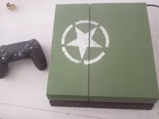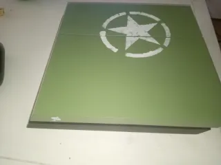Console PlayStation 4 personalizzata con un design militare. Colore principale verde militare. Dettaglio di stella bianca nella parte superiore. Piccolo simbolo di carta da gioco (picche) nella parte anteriore inferiore.