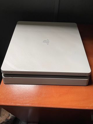 Console Playstation 4 Slim in bianco. Design elegante e compatto. Finitura in vinile fibra di carbonio. Include 2 controller neri, cavo di alimentazione e cavo HDMI. Un controller ha il joystick destro rotto e l'altro ha il drift ma funzionano bene.