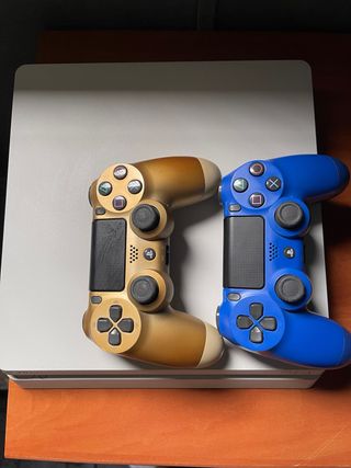 Play 4 con uso ma funziona perfettamente. Due manette per PlayStation 4 con design unici. - Manetta bianca con spruzzi rosa. - Manetta con design grafico e colori vivaci. E due giochi di Dragon Ball, Call of Duty 3 e FIFA 18