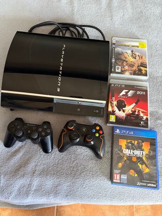 Console Playstation 3 in colore nero, pronta per ore di intrattenimento. Include due controller per giocare con gli amici e vari titoli. - Console Playstation 3 - Controller Sony Dualshock 3 - Controller di terze parti - Gioco: Motorstorm - Gioco: F1 2011 - Gioco: Call of Duty Black Ops 4 (PS4) - E molti altri giochi installati