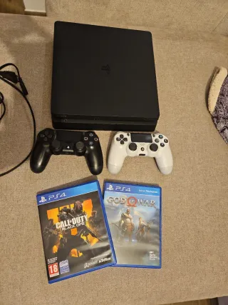 Console Playstation 4 in colore nero, pronta per l'uso. Include due controller (uno nero e uno bianco). Include i giochi Call of Duty: Black Ops 4 e God of War.