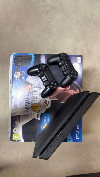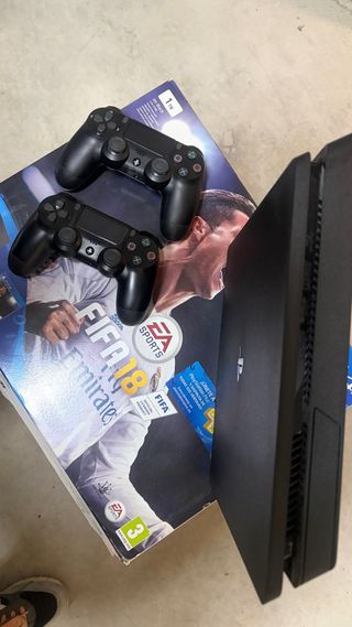Console PlayStation 4 Slim in colore nero, pronta per ore di divertimento. Include il videogioco FIFA 19, un controller DualShock 4, un controller aggiuntivo mimetico, 1 tera di memoria. Funziona perfettamente. È stata revisionata e manutenuta per mantenerla in ottime condizioni.