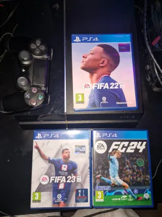 In vendita pacchetto PS4 con 3 giochi FIFA diversi, incluso il controller e tutti i cavi necessari. Il pacchetto include: PS4, controller, FIFA 22, FIFA 23, FIFA 24, cavo HDMI, cavo di alimentazione, cavo del controller.