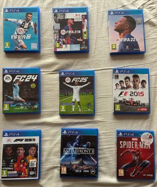 Lotteria di 9 videogiochi per PlayStation 4. - FIFA 19 - FIFA 21 - FIFA 22 - FC 24 - FC 25 - F1 2015 - F1 23 - Star Wars Battlefront II - Marvel's Spider-Man