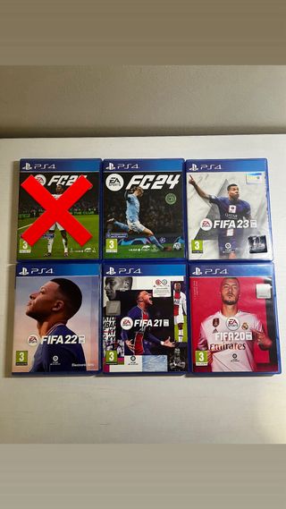 Conjunto di sei videogiochi di calcio per PlayStation 4. ⚠️PREZZO DA NEGOZIARE ⚠️ - FIFA FC24 - FIFA 23 - FIFA 22 - FIFA 21 - FIFA 20