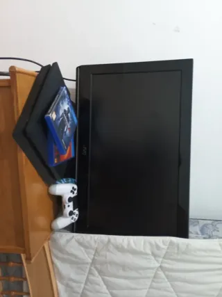 Console Playstation 4 in colore nero, insieme a un televisore. Include 2 controller, uno con r2 e l2 funzionante ma rotto. Due videogiochi: Uncharted 4 e Red Dead Redemption 2. Televisore JVC, credo 24 pollici.