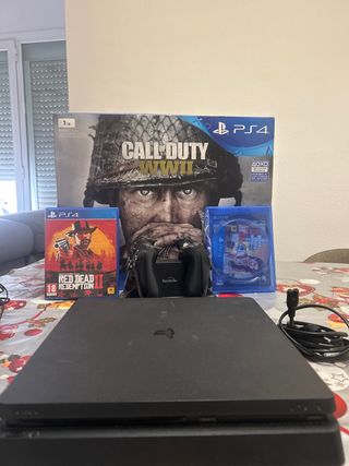 Console PlayStation 4 Slim da 500GB in colore nero, pronta per l'uso. Include un controller e cinque videogiochi. È in perfette condizioni. Controller DualShock 4 incluso. Giochi: Resident Evil VII, Days Gone, FIFA 21, The Last of Us Remastered, Red Dead Redemption 2. Non ho la scatola. Non accetto scambi.