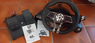 Volante da corsa con pedaliera compatibile con PlayStation 4 e PlayStation 3. - Design sportivo con finiture cromate. - Pulsanti PlayStation integrati sul volante. - Pedali inclusi per un'esperienza di guida completa. Volante e Pedaliera Hurricane per PS 4/3. Ha preso polvere una settimana, quindi nuova. Comandi al volante e cambio sequenziale come da foto. Sistema di fissaggio tramite ventose poste sotto il volante, completo di imballo originale e istruzioni di configuraizone e tuning