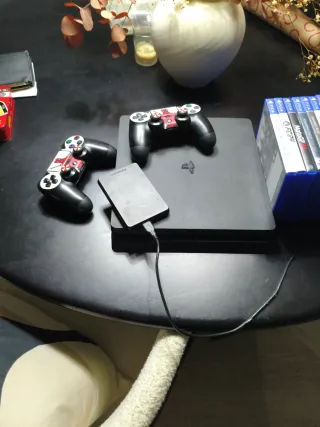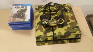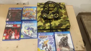 Console PlayStation 4 Slim da 500 GB in colore nero, pronta per l'uso. - Controller DualShock 4 con design mimetico. - Hard disk esterno Seagate da 2 Tera. - Cavi di alimentazione, USB e HDMI inclusi. Il controller ha un piccolo ritardo nell'analogico sinistro, ma non influisce sulla giocabilità.