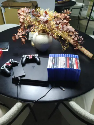 Console PlayStation 4 Slim in colore nero con 500GB di spazio di archiviazione. Include un controller e vari giochi. Fornisce cavo di alimentazione, cavo HDMI e cavo per il controller. La console e i giochi sono in ottime condizioni e funzionano correttamente. Controller DualShock 4. Hard disk da 500GB.