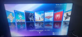 Console PlayStation 4 da 1TB in colore nero, include: console PlayStation 4, hard disk da 1TB, controller DualShock 4, cavi di connessione e ricarica, manuali. Console PS4 1TB, con cavi, controller, istruzioni e base per posizionarla in piedi, poco utilizzata, ancora in firmware 5.05, sbloccata per l'uso di copie di backup e include molti giochi installati.