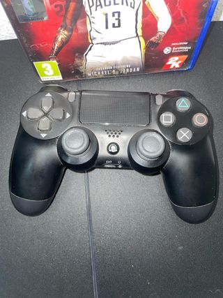Console PlayStation 4 in colore nero, con due controller DualShock 4 e il videogioco NBA 2K23. I controller e la console funzionano perfettamente. Venduto con i cavi per il funzionamento. Include console PS4, due controller DualShock 4 e il videogioco NBA 2K23.