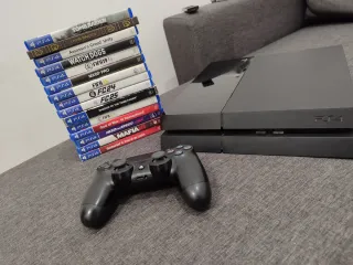 Console PlayStation 4 in colore nero, pronta per l'uso. Include 11 videogiochi: Mad Max, Grand Theft Auto V, Call of Duty: Black Ops III, Road Rage, Need for Speed, The Last of Us Parte II, The Last of Us Remastered, FIFA 22, The Witcher 3: Wild Hunt. Include un controller di colore blu e rosso. Prezzo negoziabile.