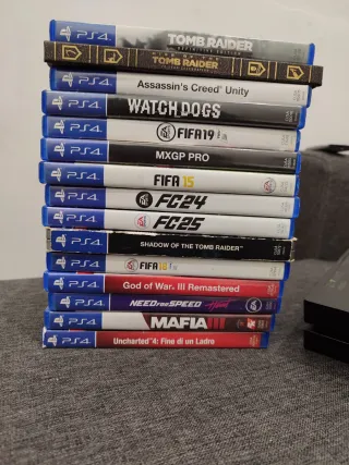 Vendo console PlayStation 4 (PS4) di colore nero, completa di controller e 14 videogiochi. - Console PlayStation 4 (PS4) - Controller DualShock 4 - Giochi inclusi: Tomb Raider Definitive Edition Tomb Raider Assassin's Creed Unity Watch Dogs FIFA 19 MXGP Pro FIFA 15 FC 24 FC 25 Shadow of the Tomb Raider God of War III Remastered Need for Speed Mafia III Uncharted 4: Fine di un Ladro