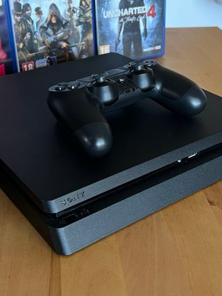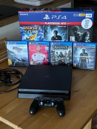 Console PlayStation 4 Slim con disco rigido da 1TB. È nuova, utilizzata solo 4 volte. Include il controller DualShock 4. Giochi inclusi: Need for Speed Rivals, FIFA 20, Assassin's Creed Syndicate, Uncharted 4. Cavi di connessione.