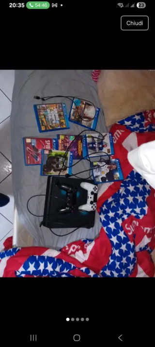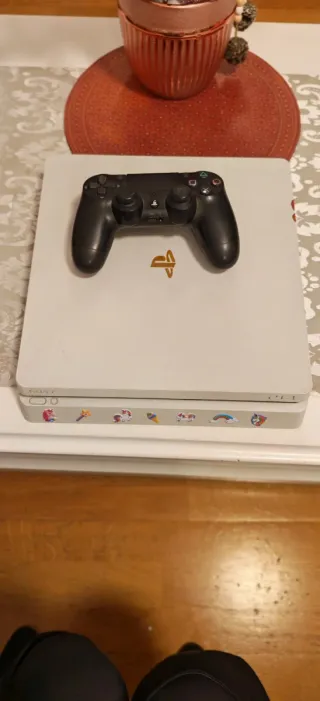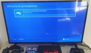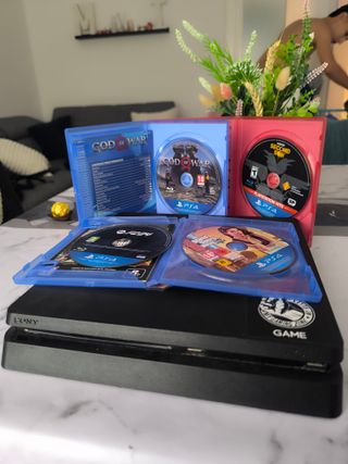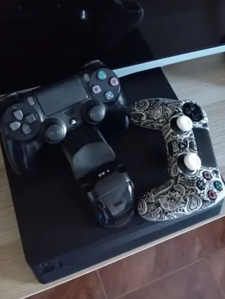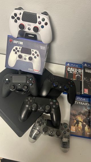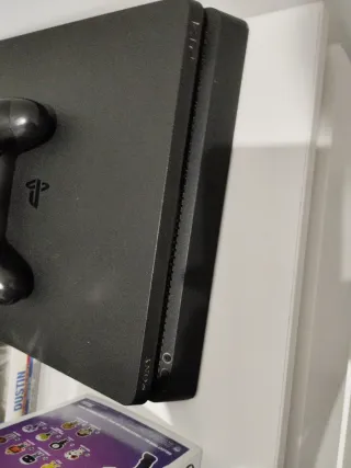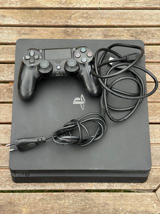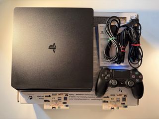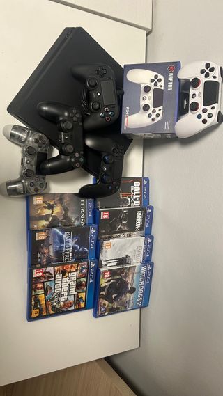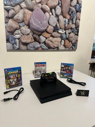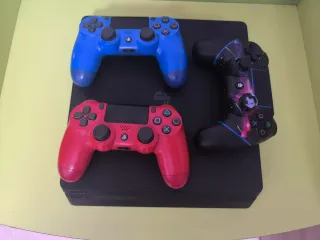 PS4 slim con 804 GB liberi, con due controller e tre giochi. Presenta un normale usura dovuta all'uso, ma funziona perfettamente. Cavo di ricarica dei controller incluso, ma non ufficiale, HDMI e cavo di ricarica inclusi. Utilizzo sempre tramite Wi-Fi, cavo ethernet non incluso. I giochi inclusi sono: Uncharted 4, Infamous: Second Son e Ratchet & Clank. Prezzo senza giochi: 85€.