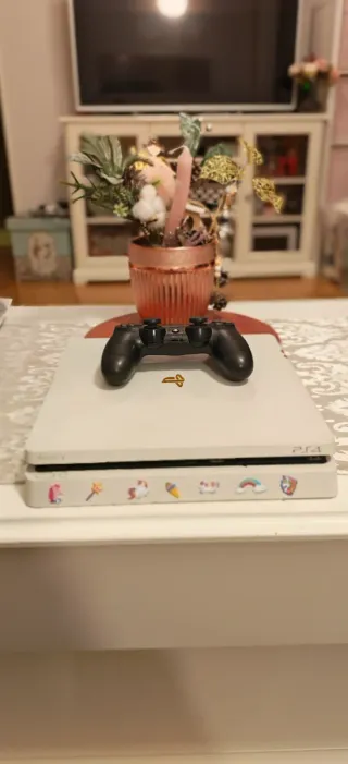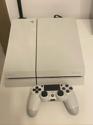 Console PlayStation 4 Slim in bianco con 500GB di spazio di archiviazione con una crepa e segni d'uso. Include un controller, ma questo non funziona senza la custodia fornita. Il problema del controller è che può essere collegato solo a un dispositivo, una volta collegato a uno senza la custodia non può essere collegato a un altro. A parte questo, può essere utilizzato senza problemi. Capacità di 500GB. Design Slim ed elegante. Controller incluso.