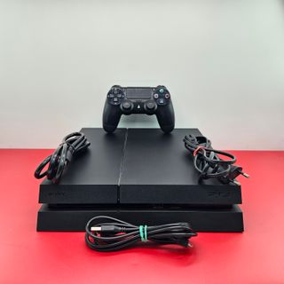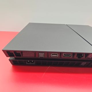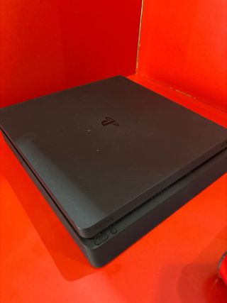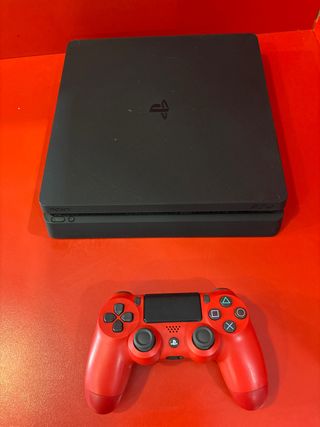 Console PlayStation 4 Slim da 500GB in colore nero, con un controller DualShock 4 rosso. Versione software 12.5. Include tutti i cavi necessari per il funzionamento. Controller originale PlayStation. Con un anno di garanzia.
