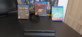 Consola PlayStation 4 Slim in colore nero. Include i seguenti videogiochi: The Crew, Gran Turismo Sport, No Man's Sky, cavo di alimentazione e controller Dualshock ufficiale. Tutto in perfette condizioni e nella sua confezione originale. Perfetto come regalo.