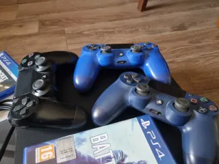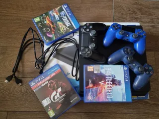 Vendo console PlayStation 4 Slim con accessori e giochi. - Console PlayStation 4 Slim - 3 controller DualShock 4 (2 blu, 1 nero) - Gioco Rocket League - Gioco Gran Turismo Sport - Gioco Battlefield V - Cavi di alimentazione e HDMI inclusi