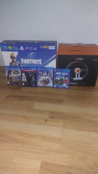 Consola PlayStation 4 Slim edizione Fortnite, con volante da corsa e vari giochi. Include volante K-Wheel. Giochi: Jurassic World Evolution, The Last of Us, Crash Bandicoot N. Sane Trilogy, F1 2021.