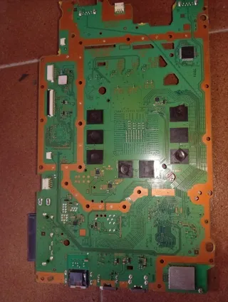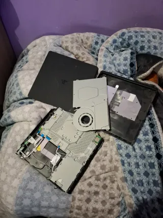 Consola PS4 Slim per pezzi di ricambio o riparazione. Ideale per tecnici o appassionati che necessitano componenti specifici. Carcasa nera. Componenti interni visibili.