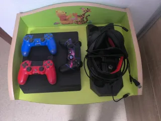 Console PlayStation 4 Slim 1 TB in colore nero. Design compatto ed elegante. Superficie liscia e opaca. 3 controller, 1 non originale. Tutti i cavi inclusi. Supporto verticale con ventilatori. Cuffie con cavo. Ho la scatola originale.
