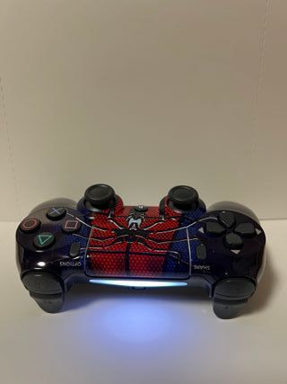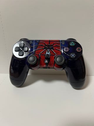Controller per PlayStation 4 con un design ispirato a Spider-Man. Design tematico di Spider-Man. Colore principale blu scuro con dettagli rossi e neri. Pulsanti e joystick in nero. Include cavo USB. Si consegna nella sua scatola originale sigillata