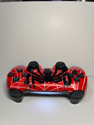 Controller per PlayStation 4 con un design ispirato a Spider-Man. Colore rosso con dettagli a forma di ragnatela. Design frontale con ragno bianco.