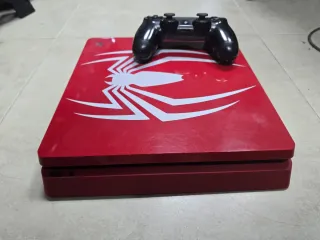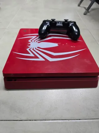 Console PlayStation 4 con design speciale ispirato a Spider-Man da 500Gb, due giochi e un controller.