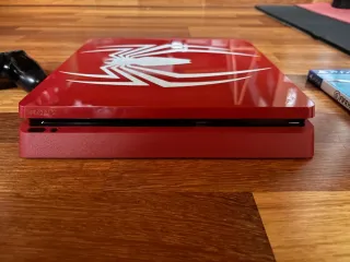 Console PlayStation 4 con un design speciale ispirato a Spiderman. Design frontale con l'iconico logo di Spiderman in bianco. Finitura in rosso vibrante.