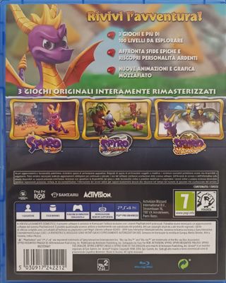 Raccolta originale per PlayStation 4 contenente le versioni rimasterizzate di Spyro the Dragon, Spyro 2: Ripto's Rage! e Spyro: Year of the Dragon. Versione PAL Italia con testi e dialoghi completamente in italiano. La confezione comprende la custodia originale e il disco di gioco, il quale si presenta in condizioni eccellenti, privo di graffi, testato e perfettamente funzionante.